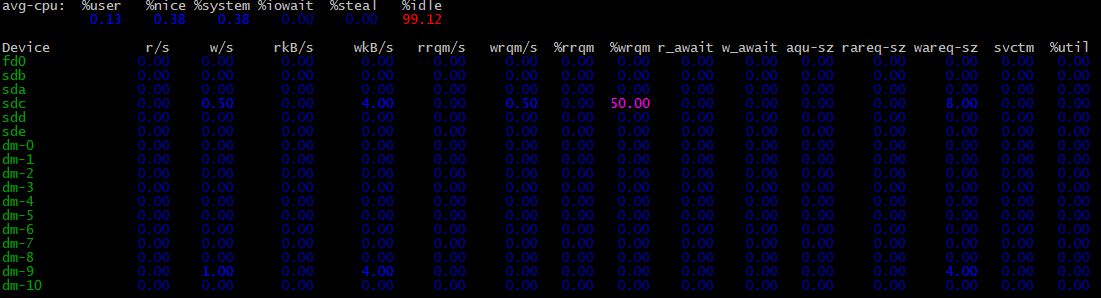 场景:查看各磁盘分区的io使用率,命令iostat -x 2,2表示,每两秒输出一次