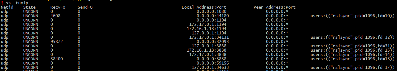 -u表示显示udp,-l表示只列出监听,-n表示只显示数字不需要对ip做dns处理